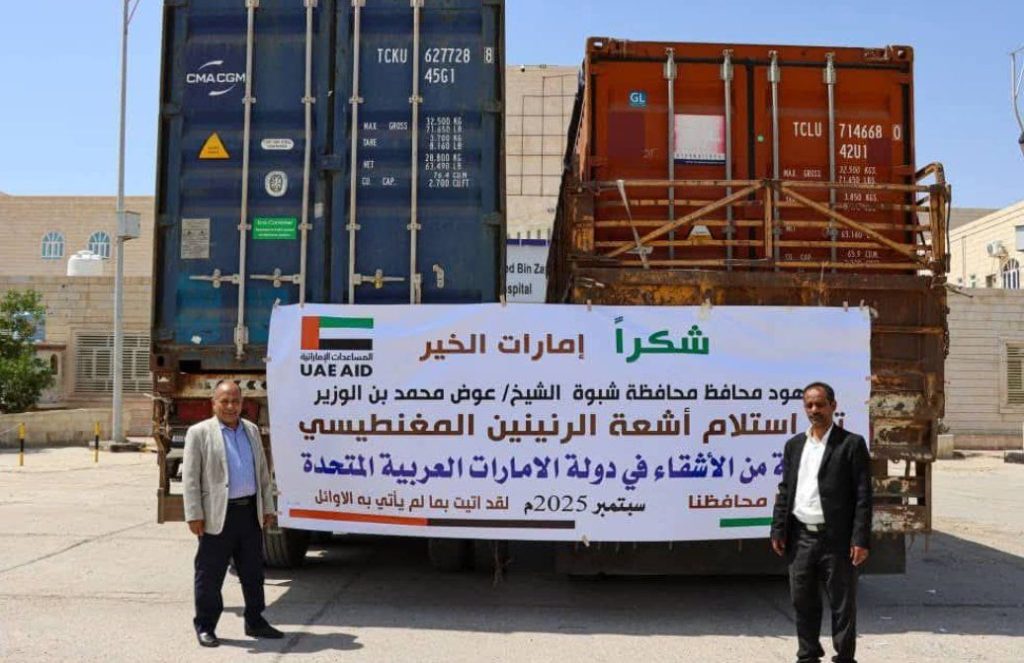 استقبل مستشفى الشيخ محمد بن زايد في محافظة شبوة، اليوم السبت، أجهزة وحدة أشعة الرنين المغناطيسي، بتكلفة 1.5 مليون دولار أمريكي، امتداداً للدعم المتواصل من الأشقاء في دولة الإمارات العربية المتحدة.
