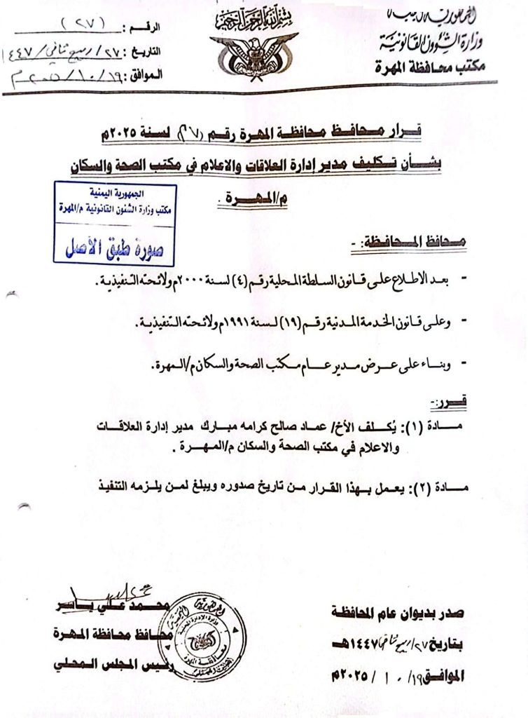 شبكة المهرة الإخبارية تبارك للإعلامي عماد باحميش تكليفه مديراً لإدارة العلاقات العامة والإعلام بمكتب الصحة
