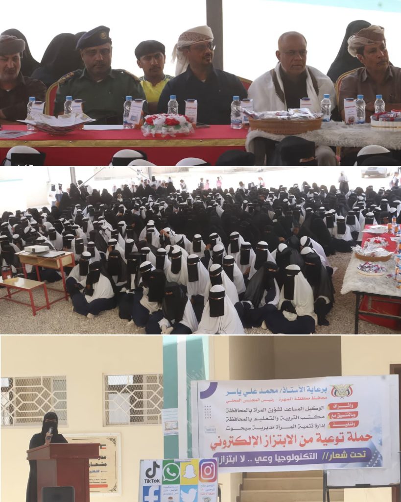 كما ألقى القائم بأعمال مدير عام مديرية سيحوت الشيخ علي محمد علي الزويدي، كلمةً عبّر فيها عن شكره لإدارة تنمية المرأة على جهودها في التوعية بمخاطر الابتزاز الإلكتروني، مؤكدًا على أهمية تعزيز الثقافة الأمنية والرقمية لدى النشء، مشددًا على ضرورة تعاون الأسرة والمدرسة والمجتمع في حماية الأبناء من مخاطر الاستخدام الخاطئ للتقنية.