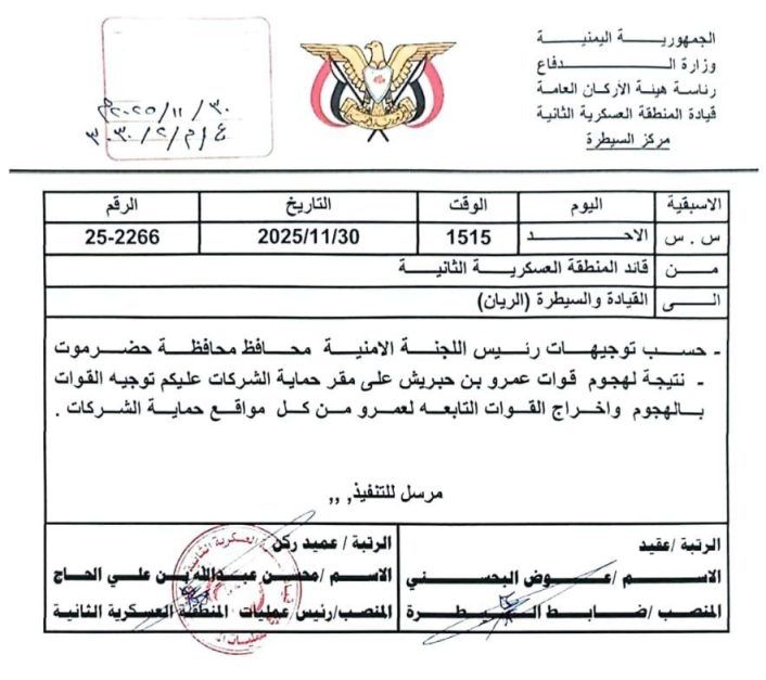 أصدر محافظ حضرموت، رئيس اللجنة الأمنية، توجيهات عاجلة إلى قيادة المنطقة العسكرية الثانية، تقضي بالتحرك الفوري لإخراج القوات التابعة لعمرو بن حبريش من مواقع حماية الشركات، وذلك عقب الهجوم الذي شنّته تلك القوات على مقر حماية الشركات. وشددت التوجيهات على ضرورة إعادة الوضع إلى ما كان عليه، وتوجيه القوات الرسمية بالسيطرة على المواقع كافة وإنهاء أي مظاهر مسلحة خارجة عن مهام الحماية المعتمدة، حفاظًا على أمن المنشآت النفطية وسلامة العاملين فيها.