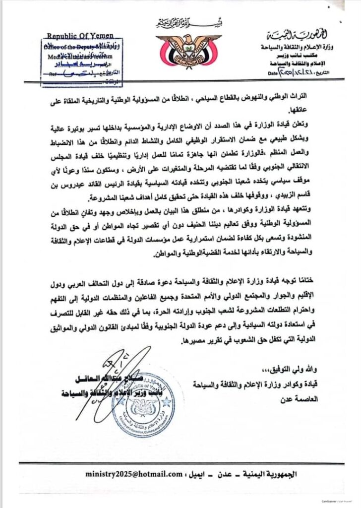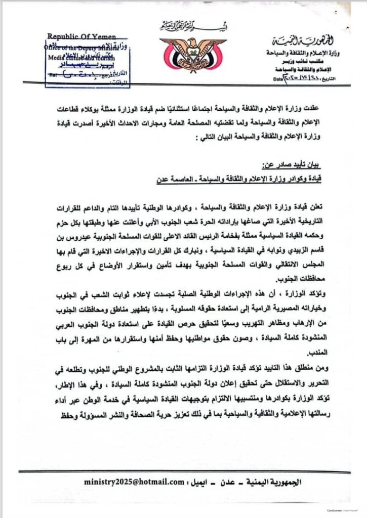 وانطلاقًا من هذا التأييد، تؤكد قيادة الوزارة التزامها الثابت بالمشروع الوطني الجنوبي، وتمسّكها بخيارات شعب الجنوب وتطلعاته في التحرير والاستقلال، حتى تحقيق إعلان دولة الجنوب المنشودة كاملة السيادة. وفي هذا الإطار، تؤكد الوزارة، بكوادرها ومنتسبيها، التزامها بتوجيهات القيادة السياسية في خدمة المواطن، عبر أداء رسالتها الإعلامية والثقافية والسياحية، بما في ذلك تعزيز حرية الصحافة والنشر المسؤول، وحفظ التراث الوطني، والنهوض بالقطاع السياحي، انطلاقًا من المسؤولية الوطنية والتاريخية الملقاة على عاتقها.