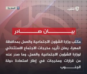 يُعلن مكتب وزارة الشؤون الاجتماعية والعمل في محافظة المهرة ممثَّلًا بقيادته الأستاذ فايز علي سهيل بلحاف وكافة موظفيه، عن تأييده ومباركته لانعقاد الاجتماع الاستثنائي لوزارة الشؤون الاجتماعية والعمل، المنعقد اليوم الأحد الموافق 21 ديسمبر 2025م، برئاسة معالي وزير الشؤون الاجتماعية والعمل الدكتور محمد سعيد الزعوري، وما صدر عنه من مخرجات وقرارات.